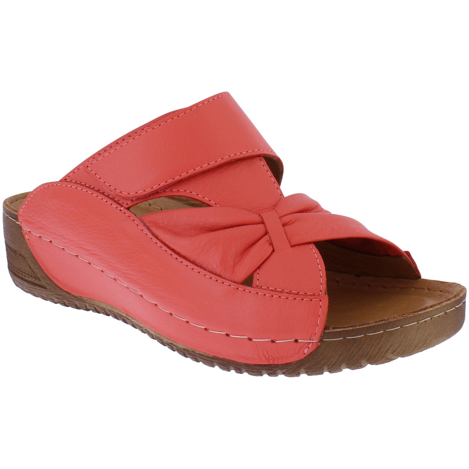 This soft summer mule in fresh colours is made with super soft leather upper, velcro adjustability across the in-step, leather lining and insole on a small wedge.